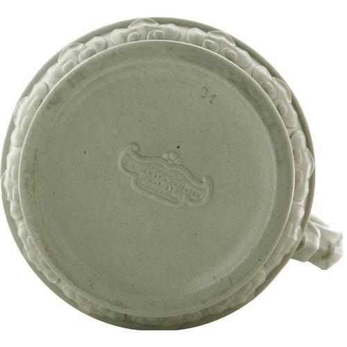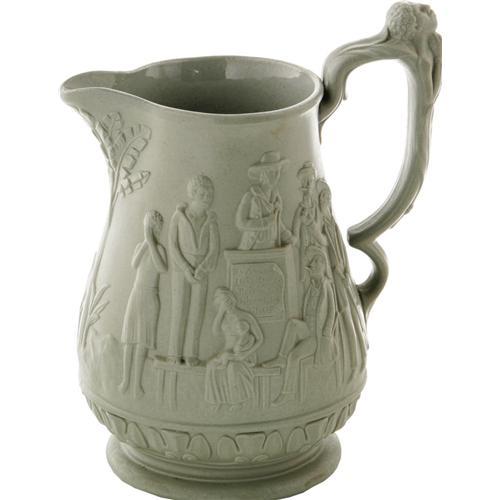 <B>Uncle Tom's Cabin Stoneware Pitcher.</B></I> 7" high, manufactured by Ridgway & Abington, Staffordshire, England, ca. 1850s. Pale olive ware with a flat exterior finish similar to that found on Wedgewood ceramics. The pitcher's one handle is molded in the form of a slave supplicant while the sides are decorated with high relief anti-slavery vignettes. One image, reproducing the most famous scene from <I>Uncle Tom's Cabin,</B></I> shows Liza and little Harry escaping slavery across the frozen Ohio River. The other side depicts a slave auction wherein the buyers lounge about contentedly while the "merchandise" weeps. The underside of this piece is stamped by the maker and is dated January 1, 1853. Overall excellent condition with no evidence of defects. An exceptional piece, this product was first marketed within months of the initial publication of <I>Uncle Tom's Cabin</B></I>.<BR><BR><b>Shipping:</b> Holloware/Pottery (<a target="_blank" href="http://www.heritageauctions.com/common/shipping.php">view shipping information</a>)