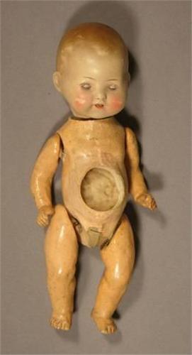 Unclothed Baby Doll. Hole in stomach. Body is light like a paper mache and the head looks like Bisque. Marked Germany 241u-51o. 9 inches long.