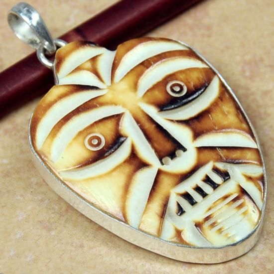 Uncommon AFRICAN BONE HANDCARVED FACE AND STERLING SILVER PENDANT, measures approx. LONG: 2.3in length