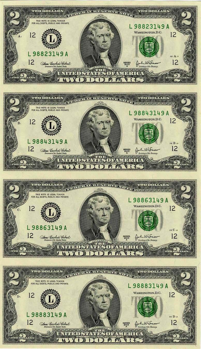 Uncut Sheet of Four $2 Federal Reserve Notes -- Series 2003-A, San Francisco -- Near Fine