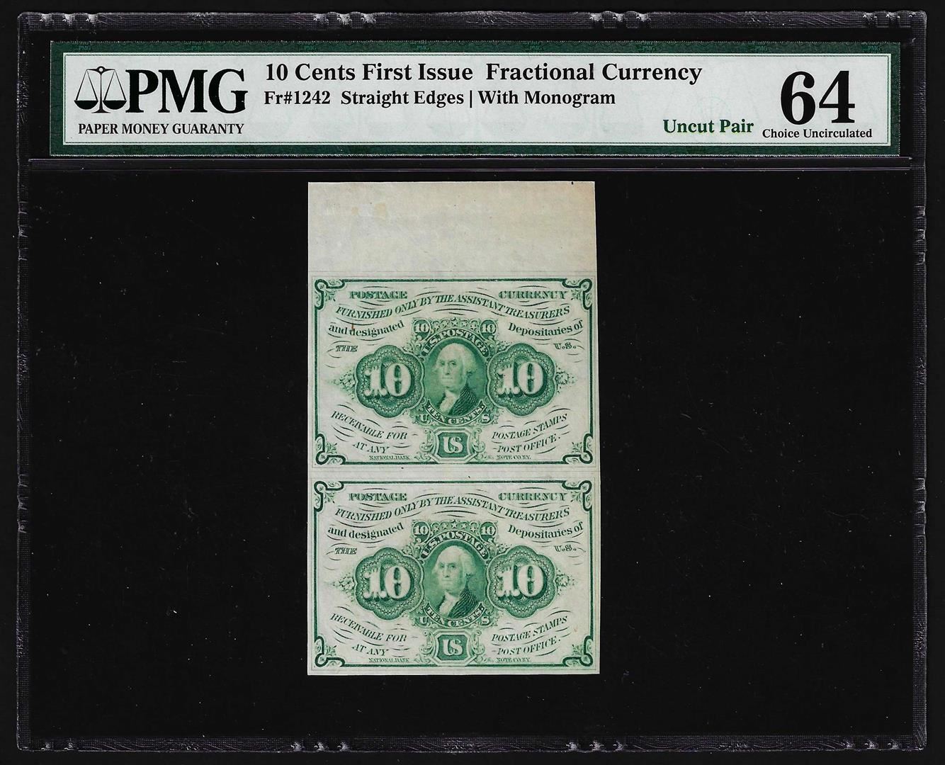 One Uncut Pair of 1862 Ten Cents First Issue Fractional Notes PMG Choice Uncirculated 64. PMG Appraised.