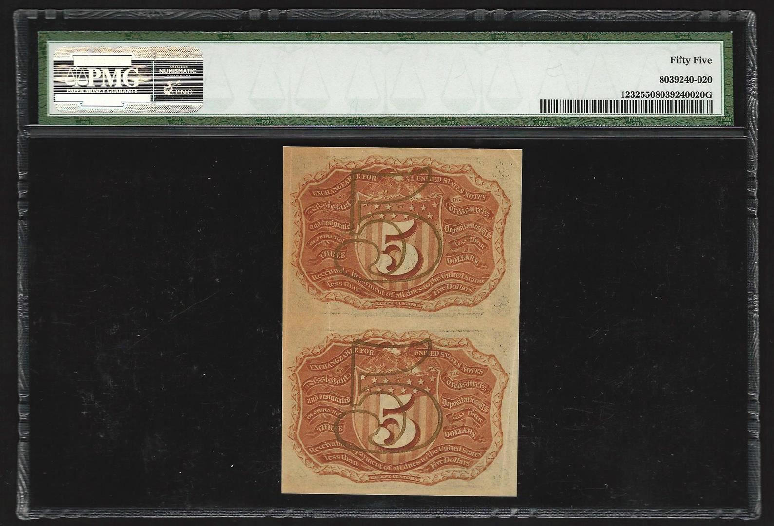 One Uncut Pair of 1863 Five Cents Second Issue Fractional Notes PMG About Uncirculated 55. PMG Appraised.