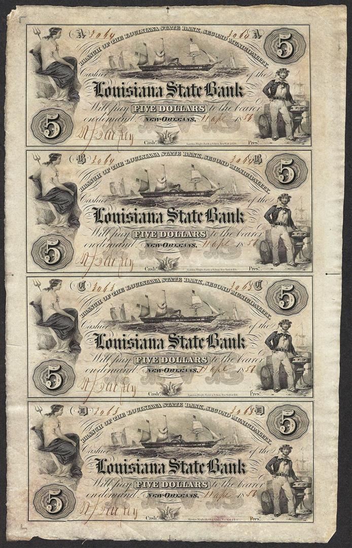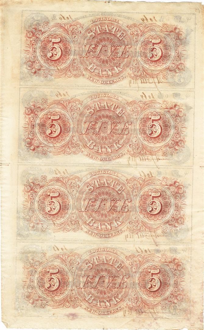 One Uncut Sheet 1800's $5 Louisiana State Bank Obsolete Notes.