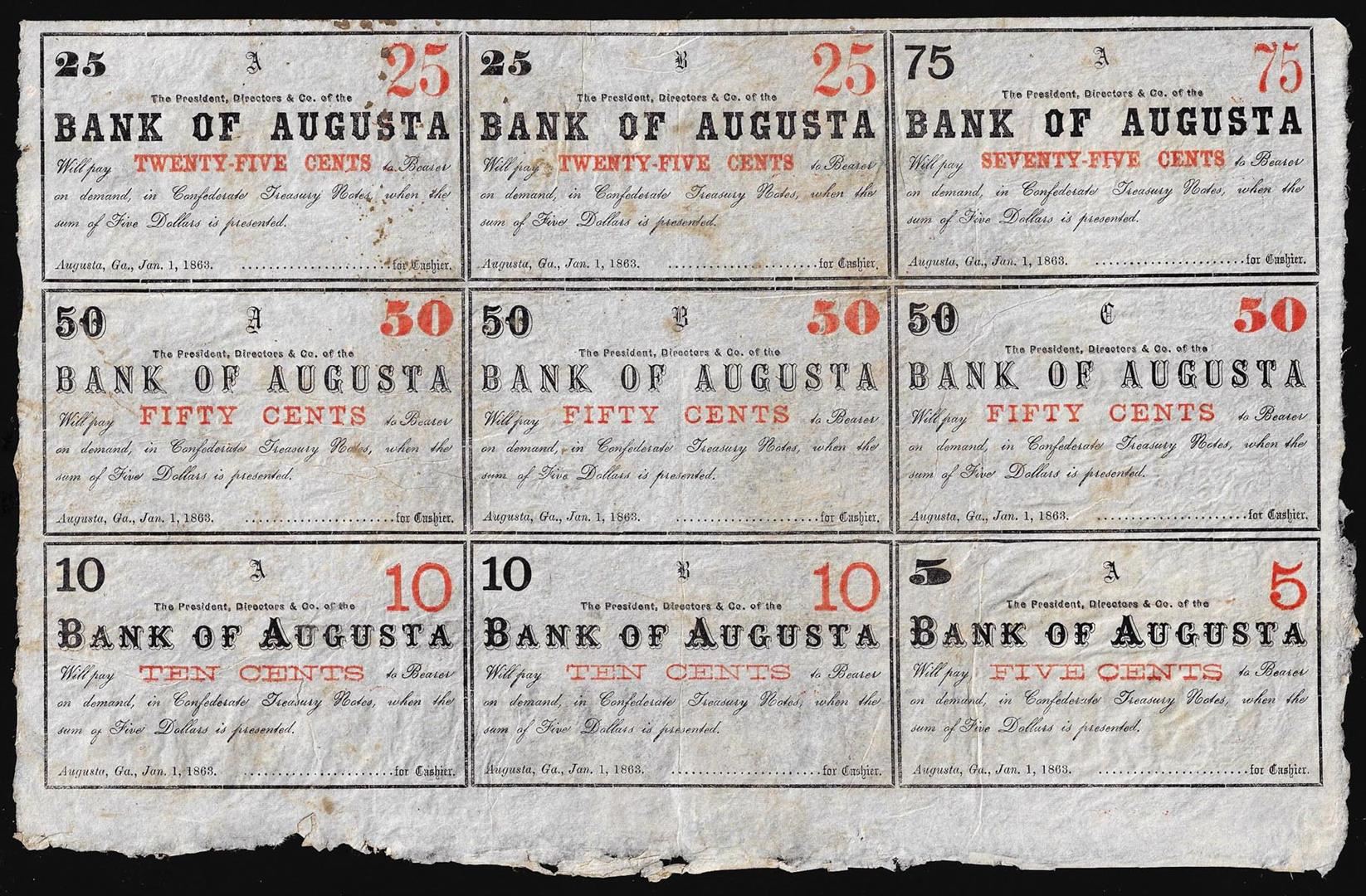 One Uncut Sheet 1863 Bank of Augusta Obsolete Civil War Era Notes.