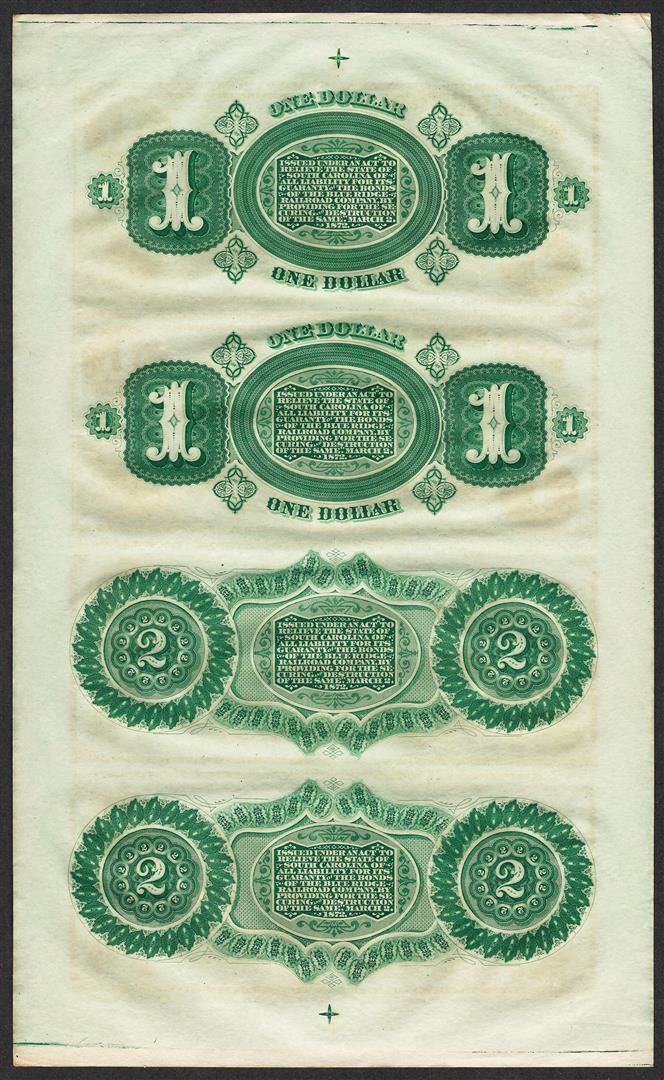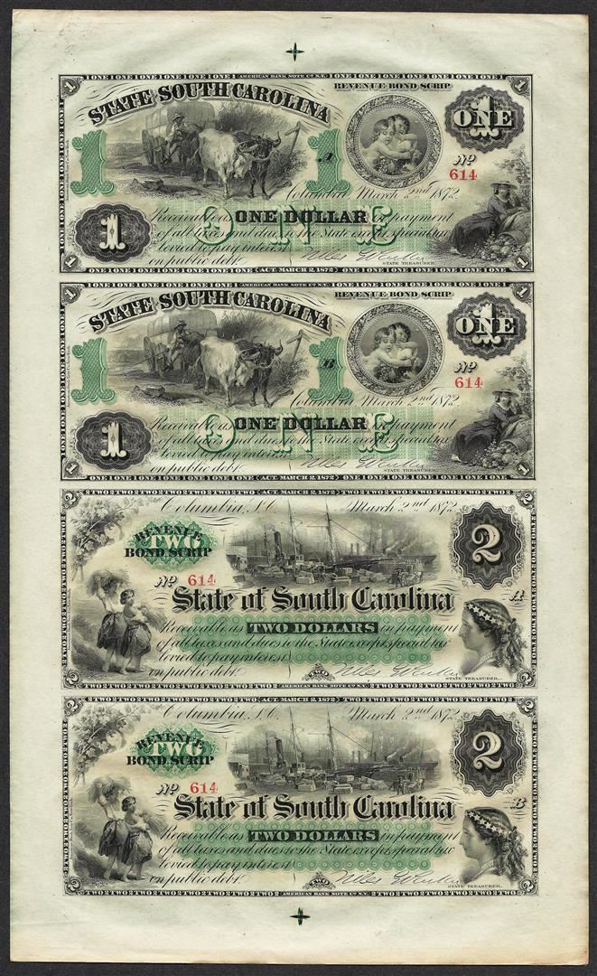 Uncut Sheet of $1/$1/$2/$2 State of South Carolina Obsolete Notes