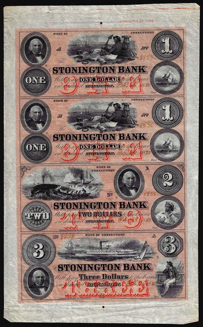 One Uncut Sheet of $1/$1/$2/$3 1880 Stonington Bank Connecticut Obsolete Notes.