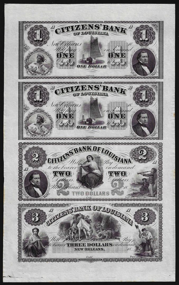 One Uncut Sheet of $1/$1/$2/$3 Citizens Bank of Louisiana Obsolete Notes.