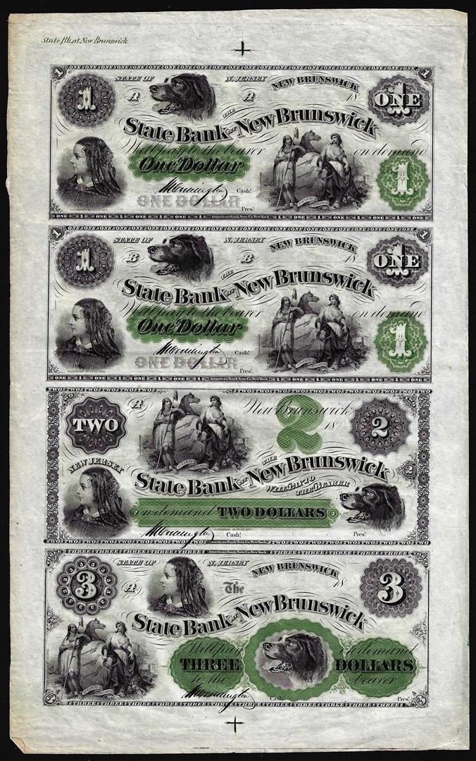 One Uncut Sheet of $1/$1/$2/$3 The State Bank at New Brunswick, NJ Obsolete Notes.