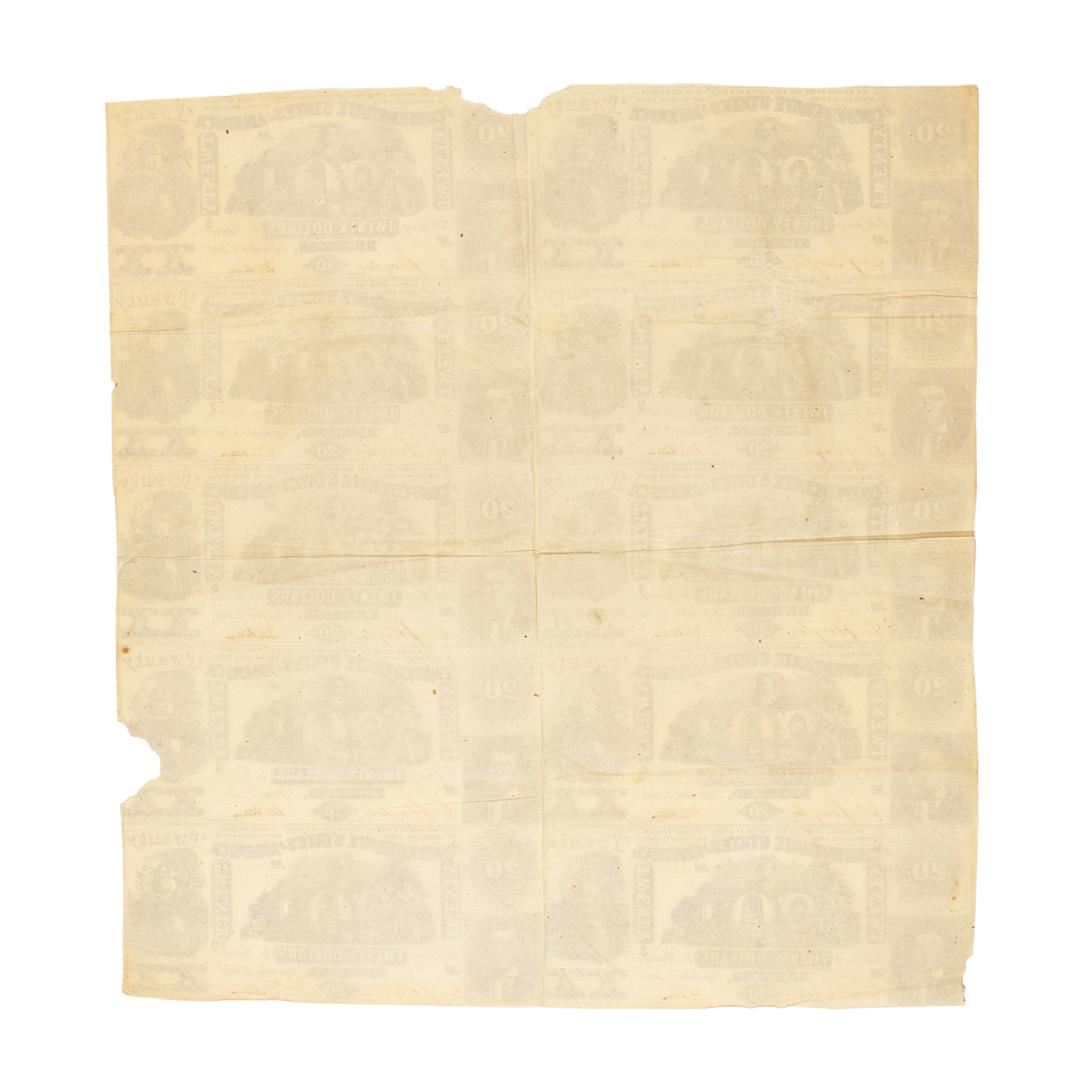 One Uncut Sheet of (10) 1861 $20 Confederate States of America Notes T-20. A rare Confederate uncut sheet,this is from the second series, and each note is fully issued. Industry is seated with Cupid and a beehive in the center, Alexander H. Stephens is at lower left, and Hope is at the right.