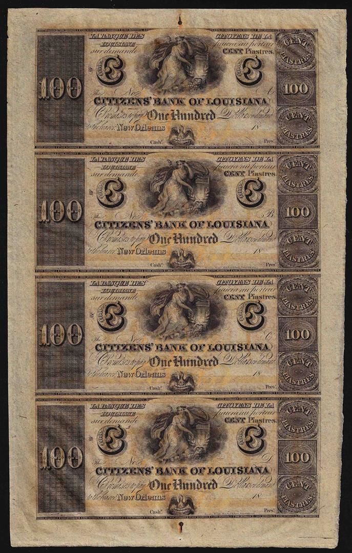One Uncut Sheet of $100 Citizens Bank of Louisiana Obsolete Notes.