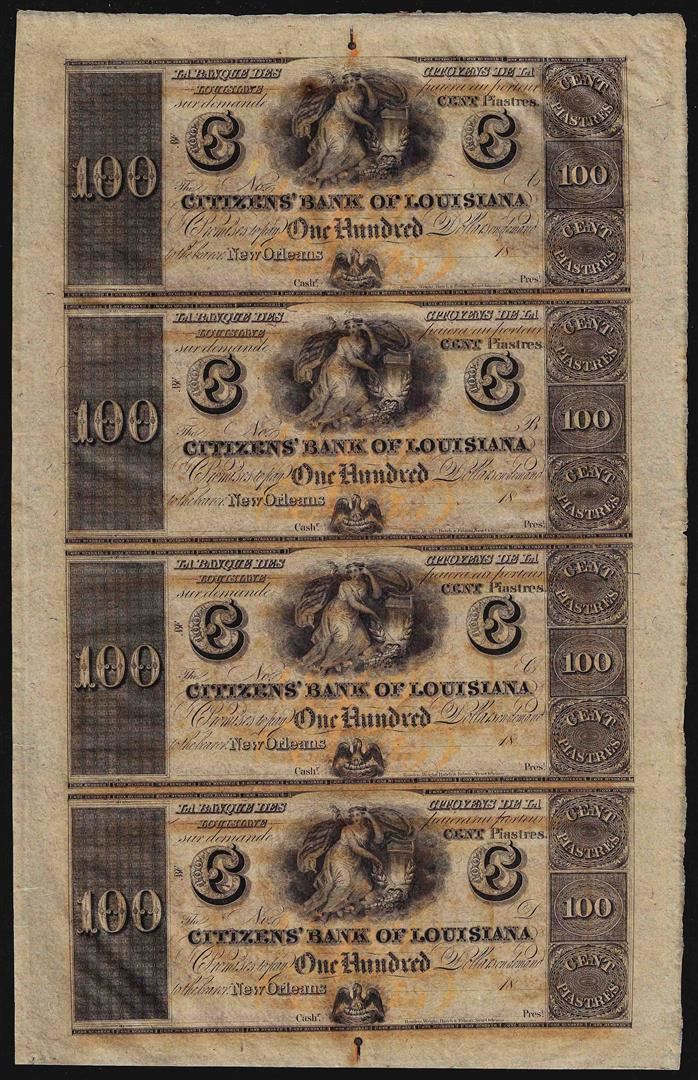 One Uncut Sheet of $100 Citizens Bank of Louisiana Obsolete Notes.