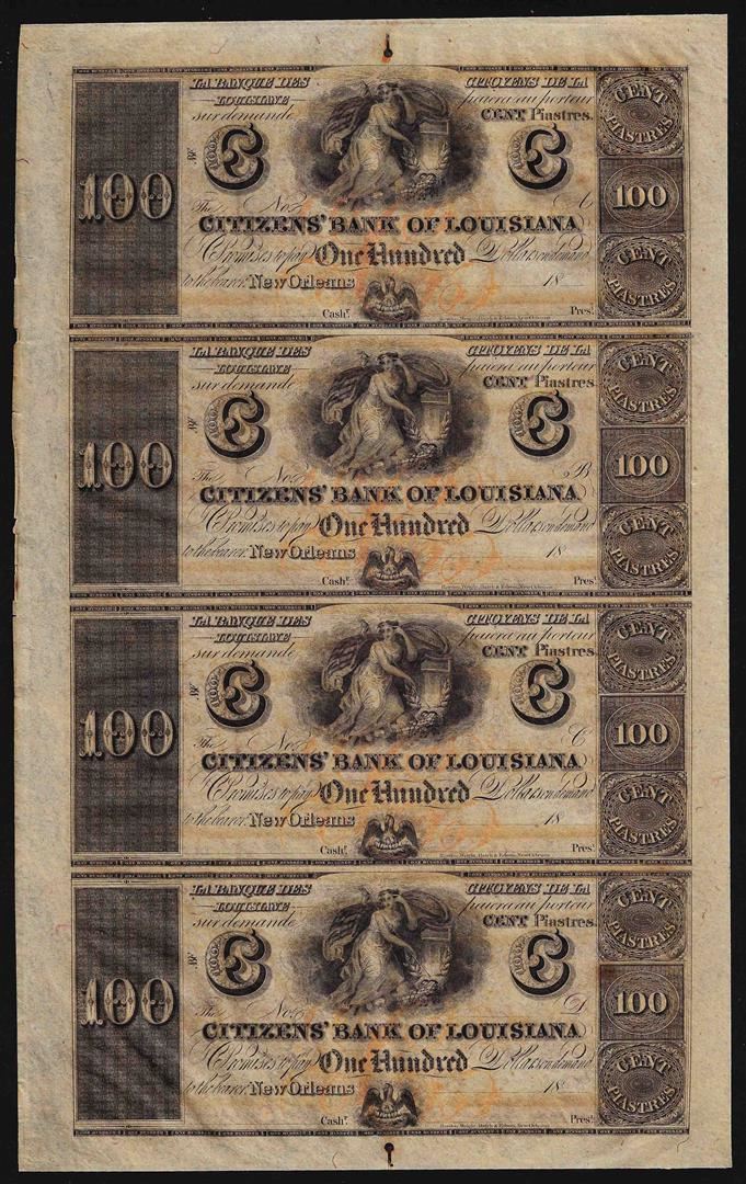 One Uncut Sheet of $100 Citizens Bank of Louisiana Obsolete Notes.