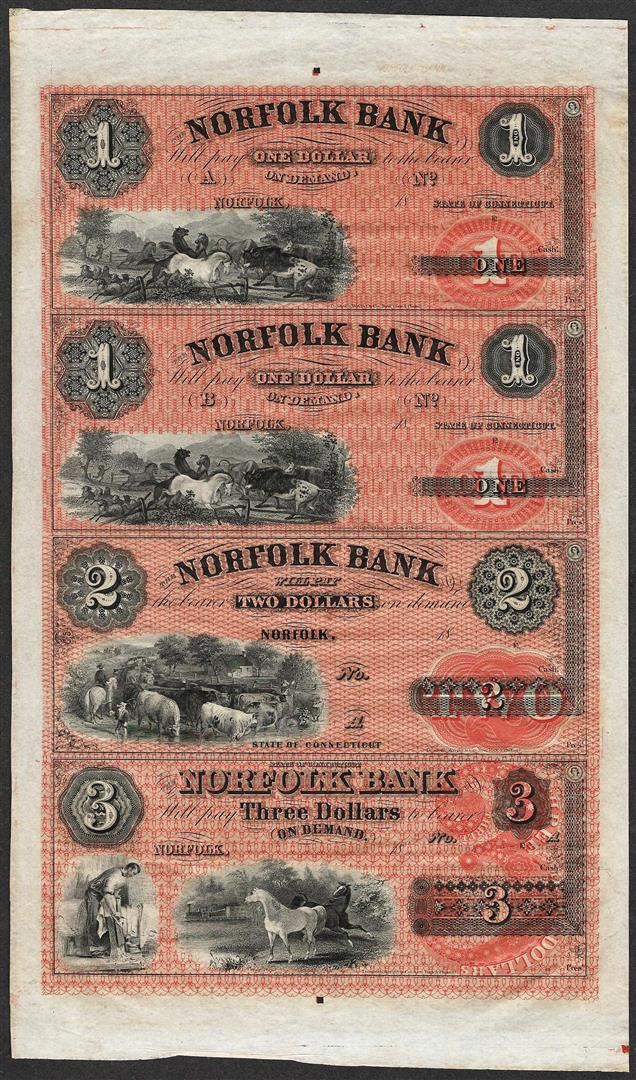 One Uncut Sheet of 1800's $1/$1/$2/$3 Norfolk Bank, CT Obsolete Notes.