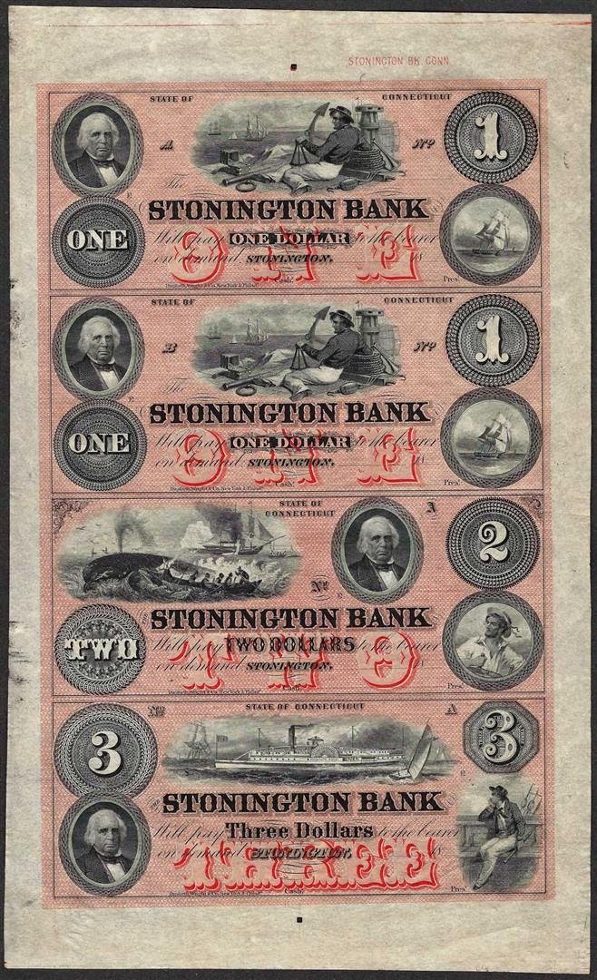 One Uncut Sheet of 1800's $1/1/$3/$4 Stonington Bank Obsolete Notes.