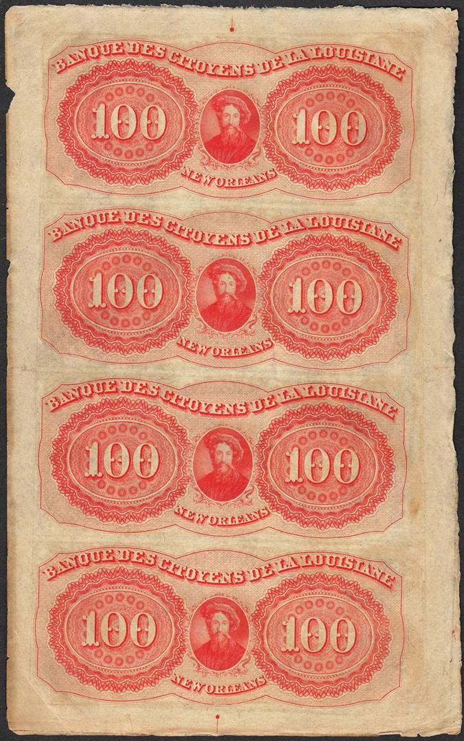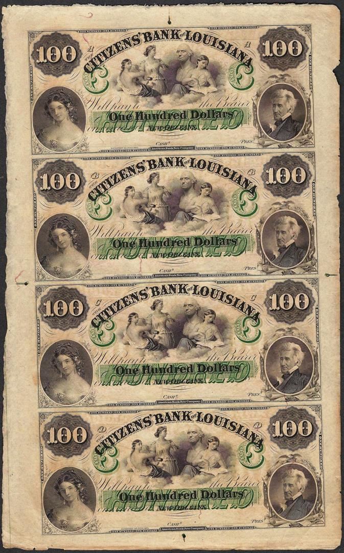 Uncut Sheet of 1800's $100 Citizens Bank of Louisiana Obsolete Notes
