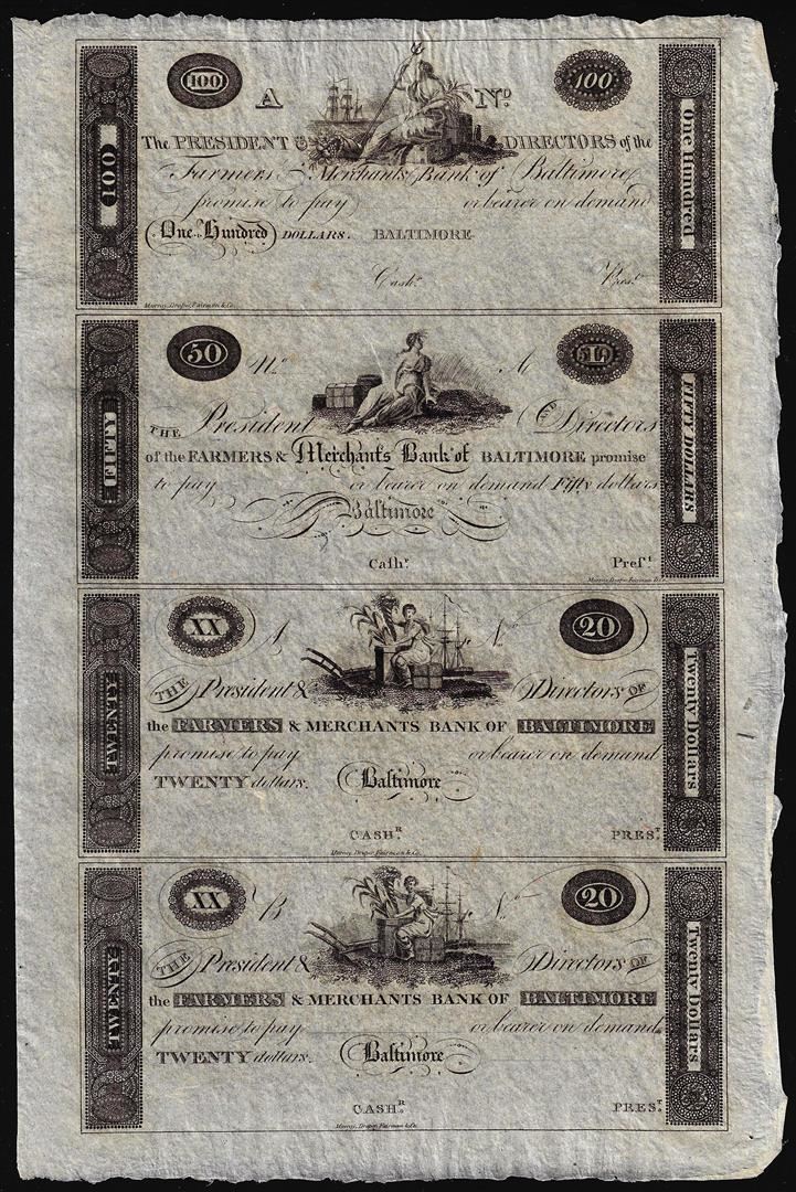 One Uncut Sheet of 1800's $20/20/50/100 Farmer's & Merchants Bank Baltimore Obsolete Notes.