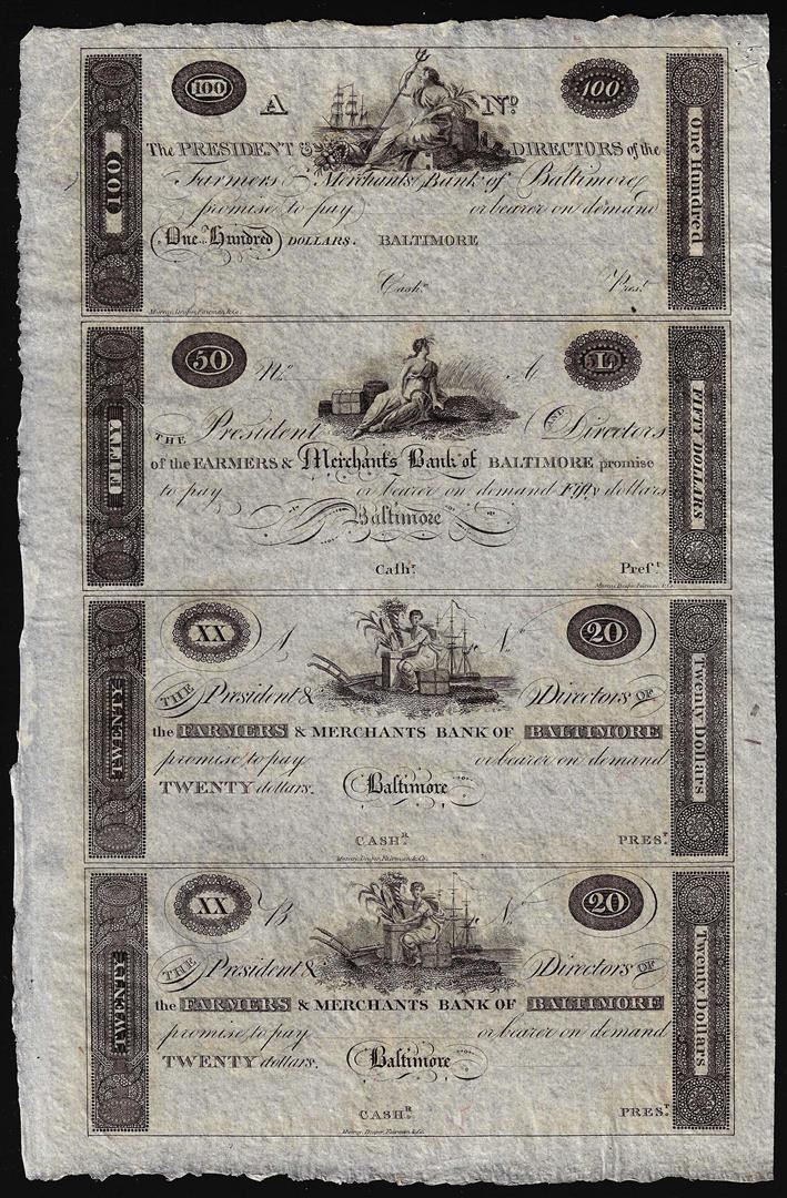 One Uncut Sheet of 1800's $20/20/50/100 Farmer's & Merchants Bank Baltimore Obsolete Notes.