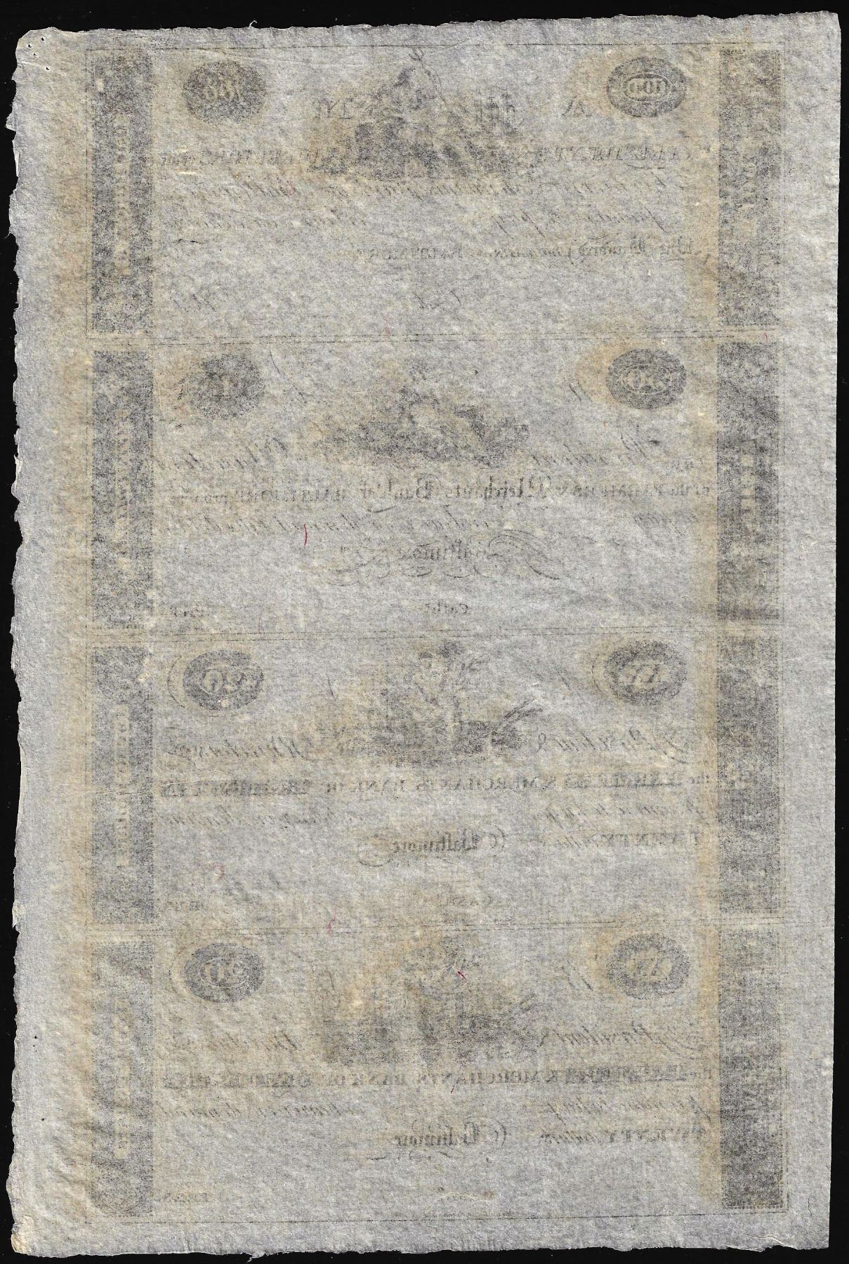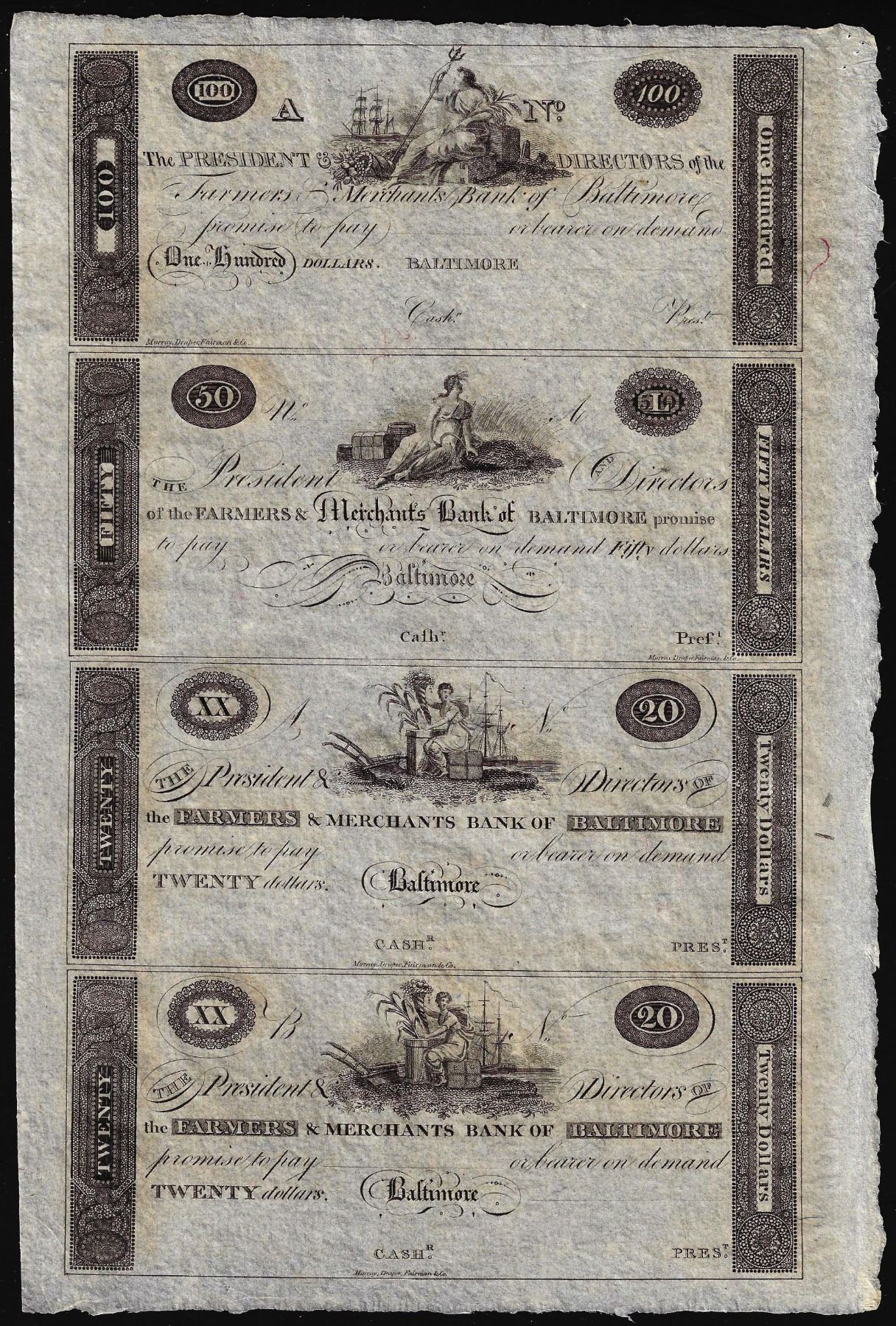 One Uncut Sheet of 1800's $20/20/50/100 Farmer's & Merchants Bank Baltimore Obsolete Notes.