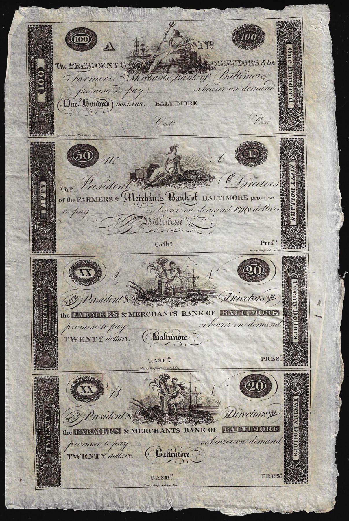 One Uncut Sheet of 1800's $20/20/50/100 Farmer's & Merchants Bank Baltimore Obsolete Notes.