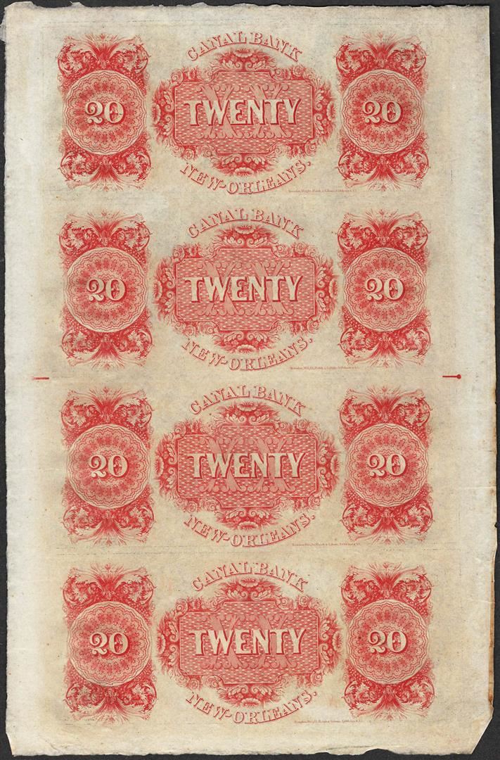 One Uncut Sheet of 1800's $20 Canal Bank Obsolete Notes.