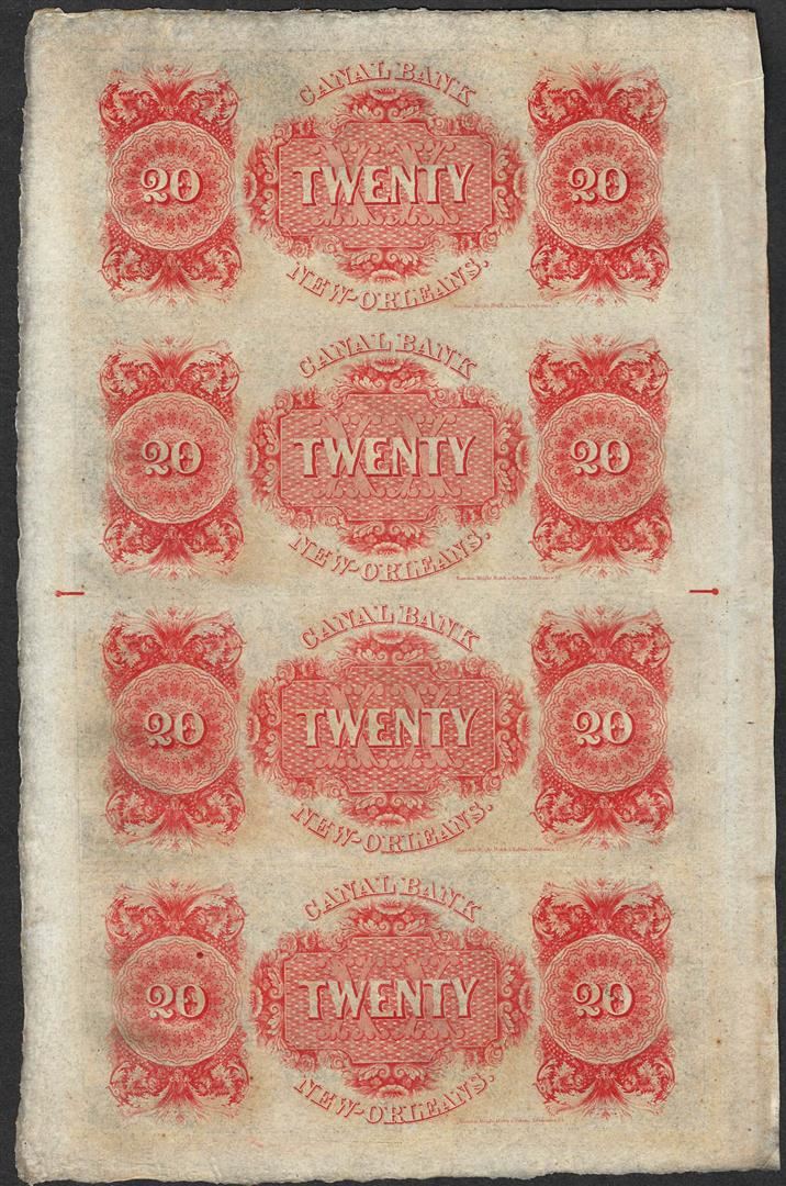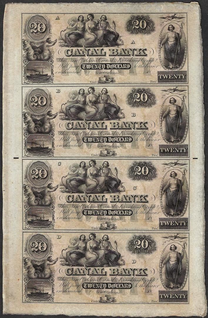 One Uncut Sheet of 1800's $20 Canal Bank Obsolete Notes.