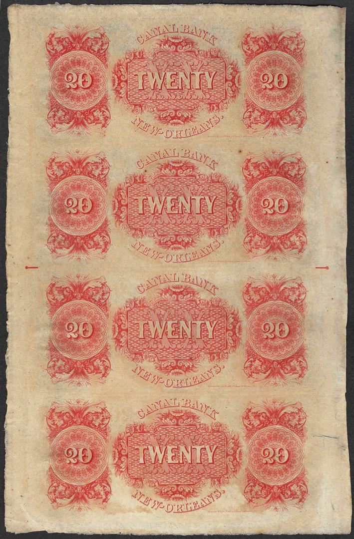 One Uncut Sheet of 1800's $20 Canal Bank Obsolete Notes.