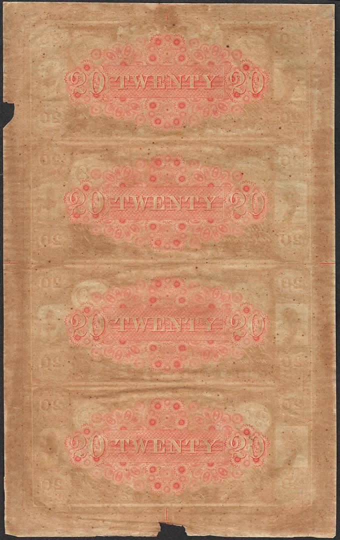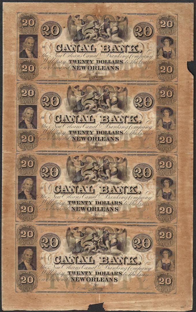 One Uncut Sheet of 1800's $20 Canal Bank Obsolete Notes.