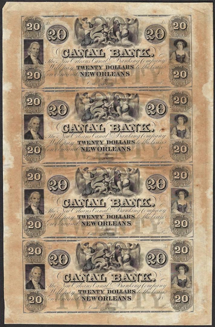 One Uncut Sheet of 1800's $20 Canal Bank Obsolete Notes.