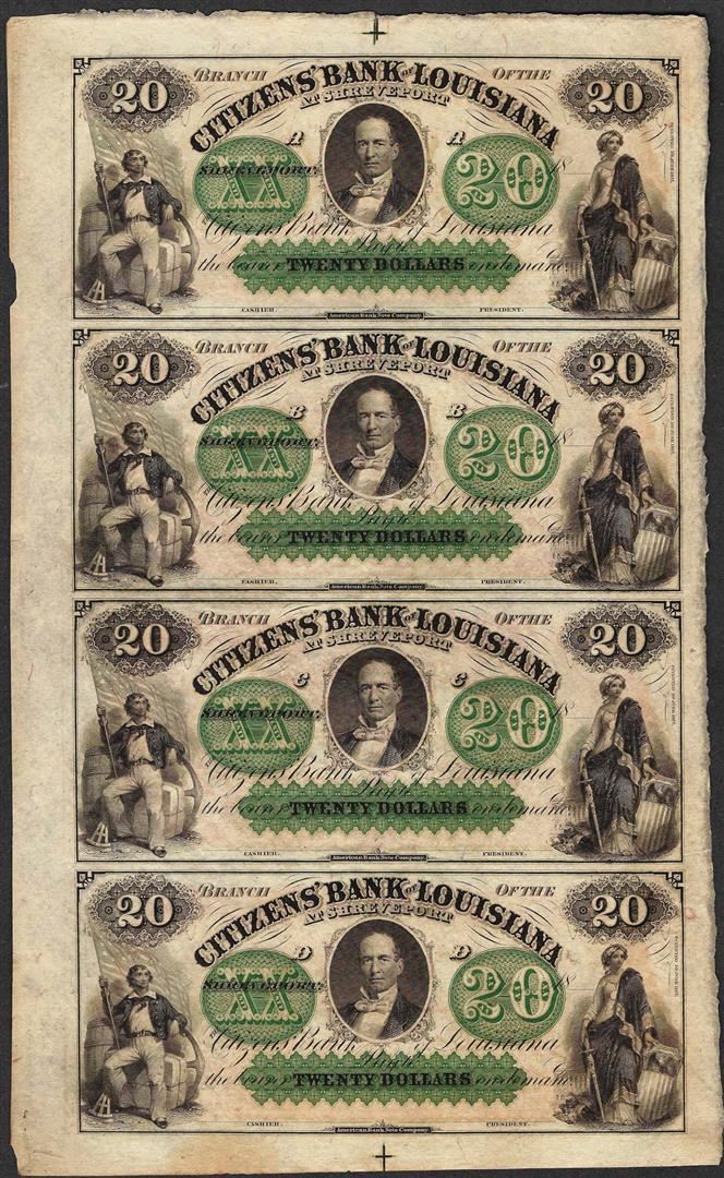 Uncut Sheet of 1800's $20 Citizens Bank of Louisiana Obsolete Notes