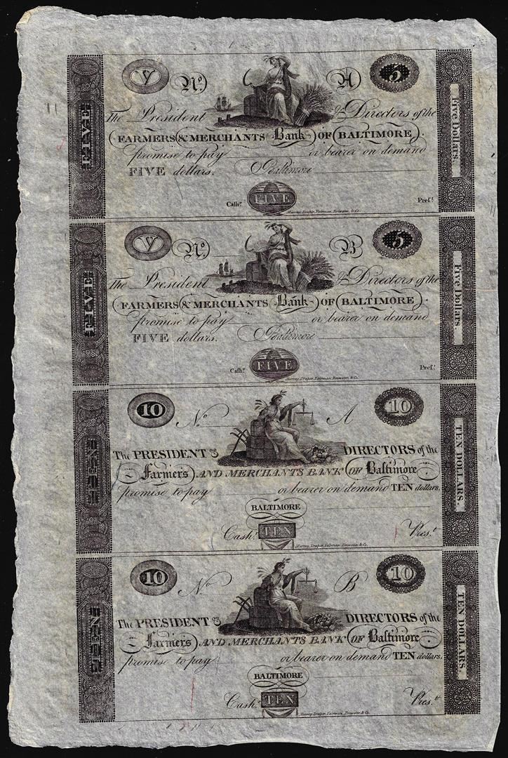 One Uncut Sheet of 1800's $5/5/10/10 Farmer's & Merchants Bank of Baltimore Obsolete Notes.