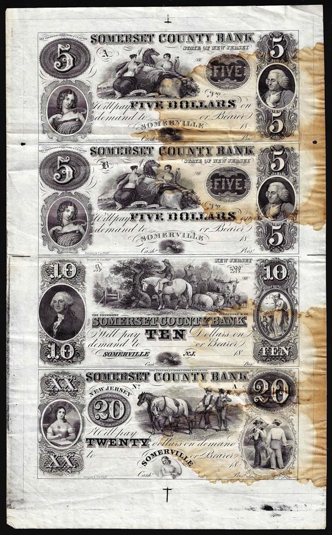 Uncut Sheet of 1800's $5/5/10/20 Somerset County Bank Somerville, NJ Obsolete Notes