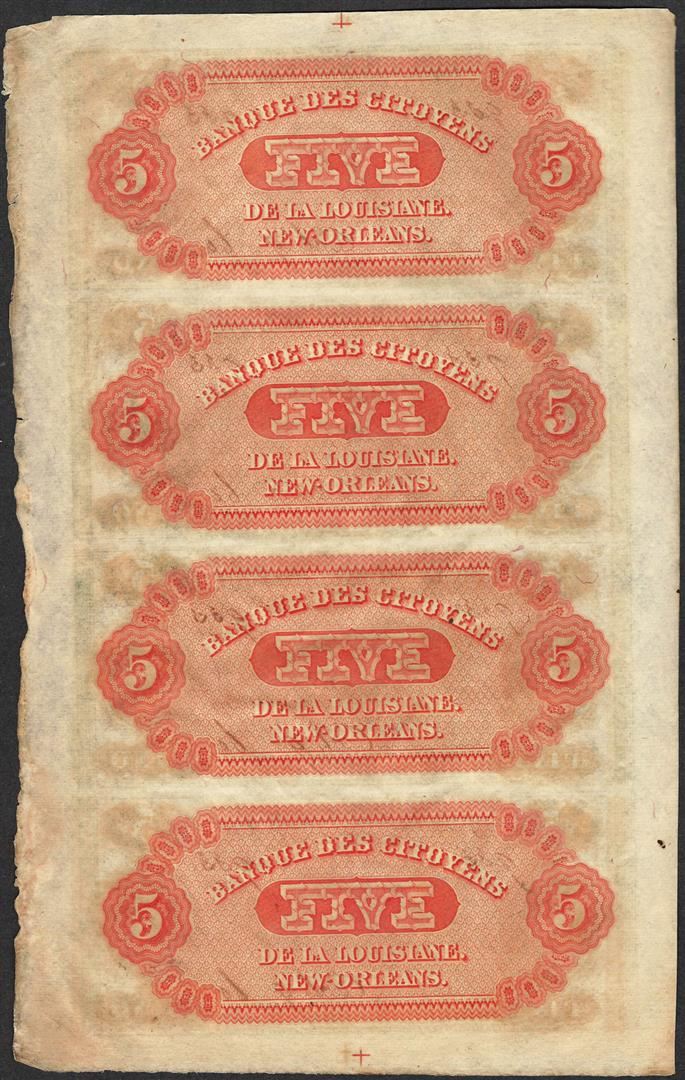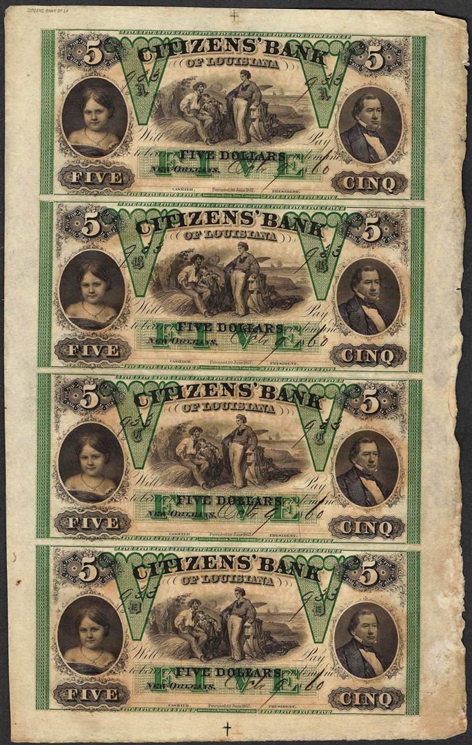 Uncut Sheet of 1800's $5 Citizens Bank of Louisiana Obsolete Notes