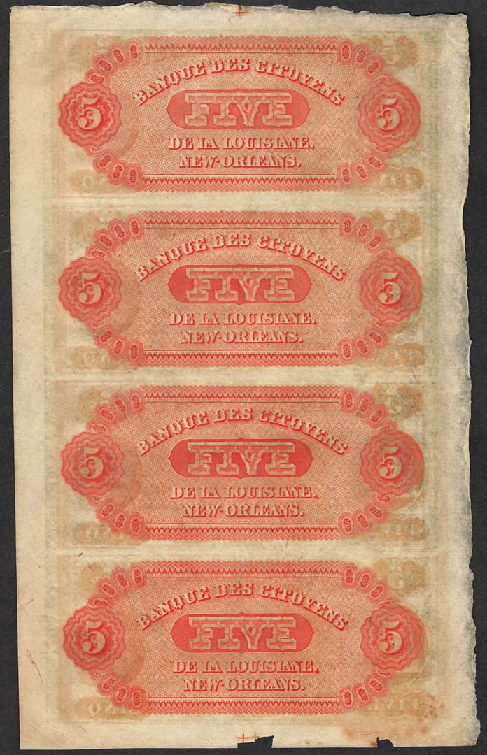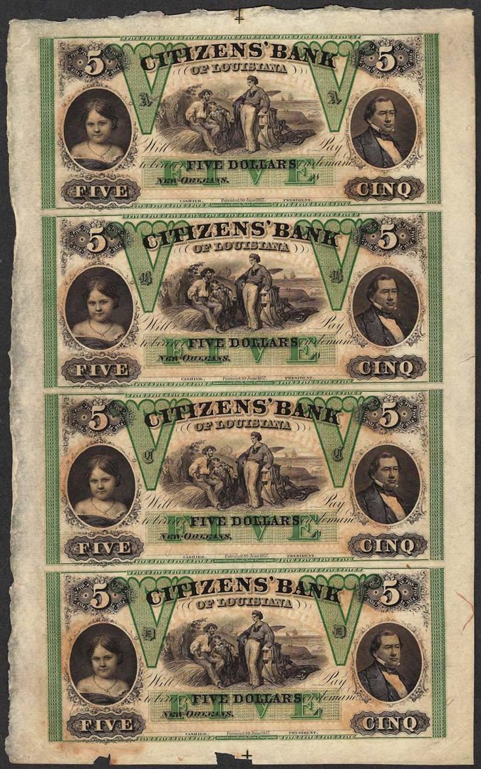 One Uncut Sheet of 1800's $5 Citizens Bank of Louisiana Obsolete Notes.