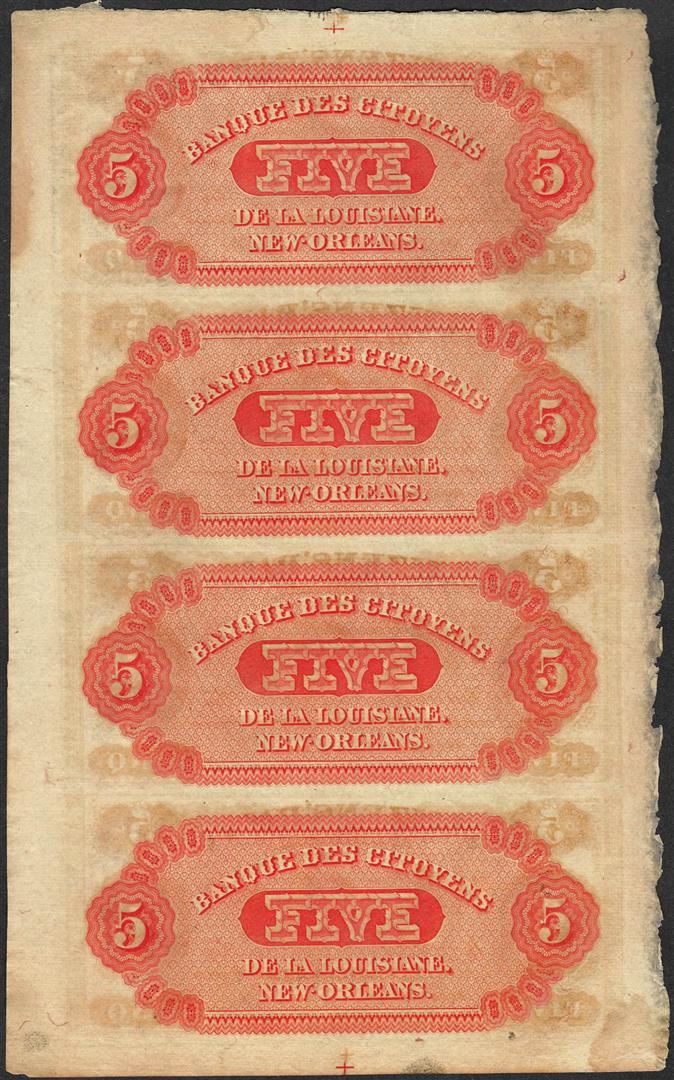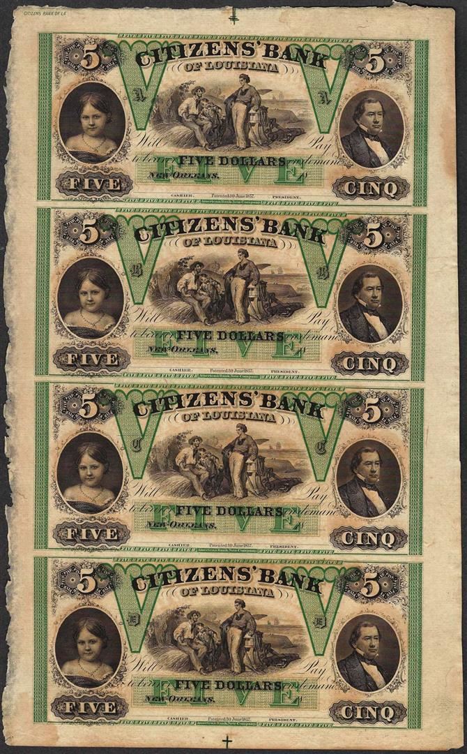 One Uncut Sheet of 1800's $5 Citizens Bank of Louisiana Obsolete Notes.