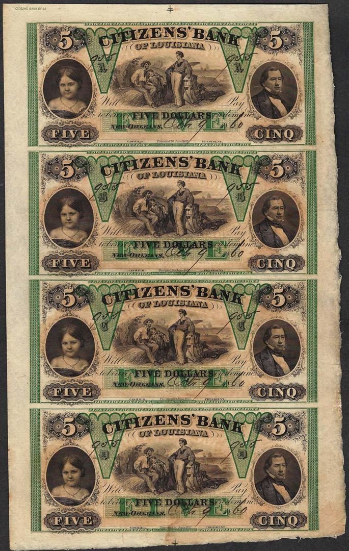 One Uncut Sheet of 1800's $5 Citizens Bank of Louisiana Obsolete Notes.