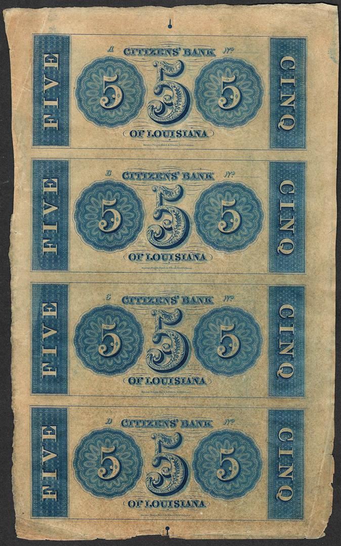 One Uncut Sheet of 1800's $5 Citizens Bank of Louisiana Obsolete Notes.