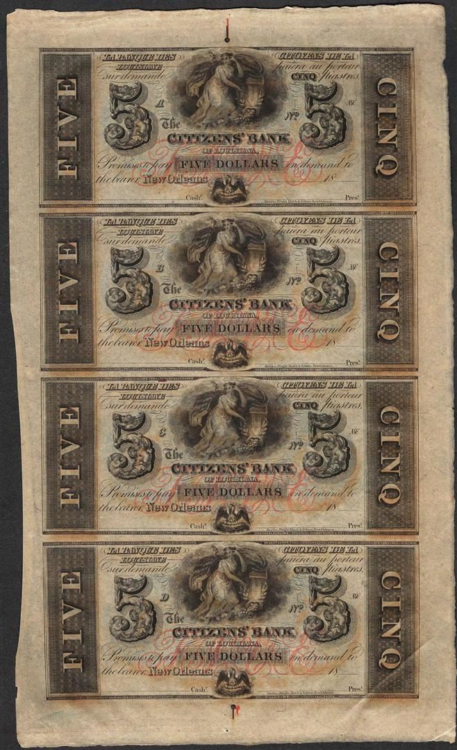 One Uncut Sheet of 1800's $5 Citizens Bank of Louisiana Obsolete Notes.