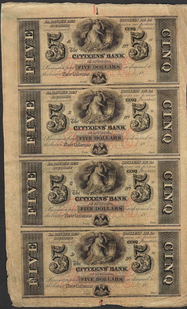 One Uncut Sheet of 1800's $5 Citizens Bank of Louisiana Obsolete Notes.