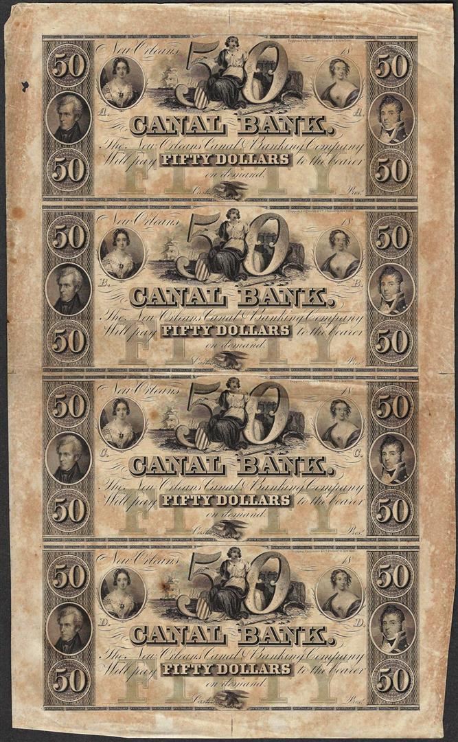 One Uncut Sheet of 1800's $50 Canal Bank Obsolete Notes.