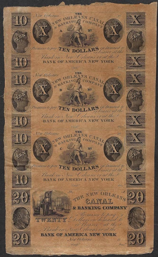 Uncut Sheet of 1800's New Orleans Canal & Banking Company Obsolete Notes