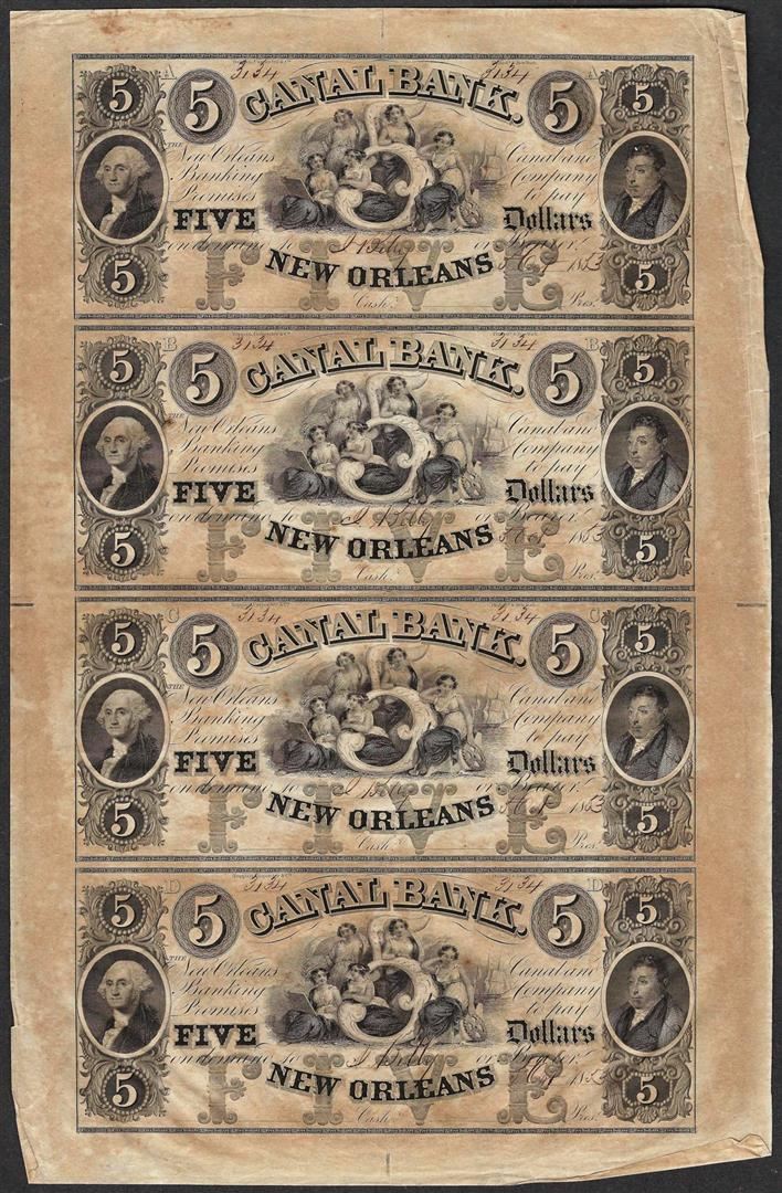 One Uncut Sheet of 1853 $5 Canal Bank Obsolete Notes.
