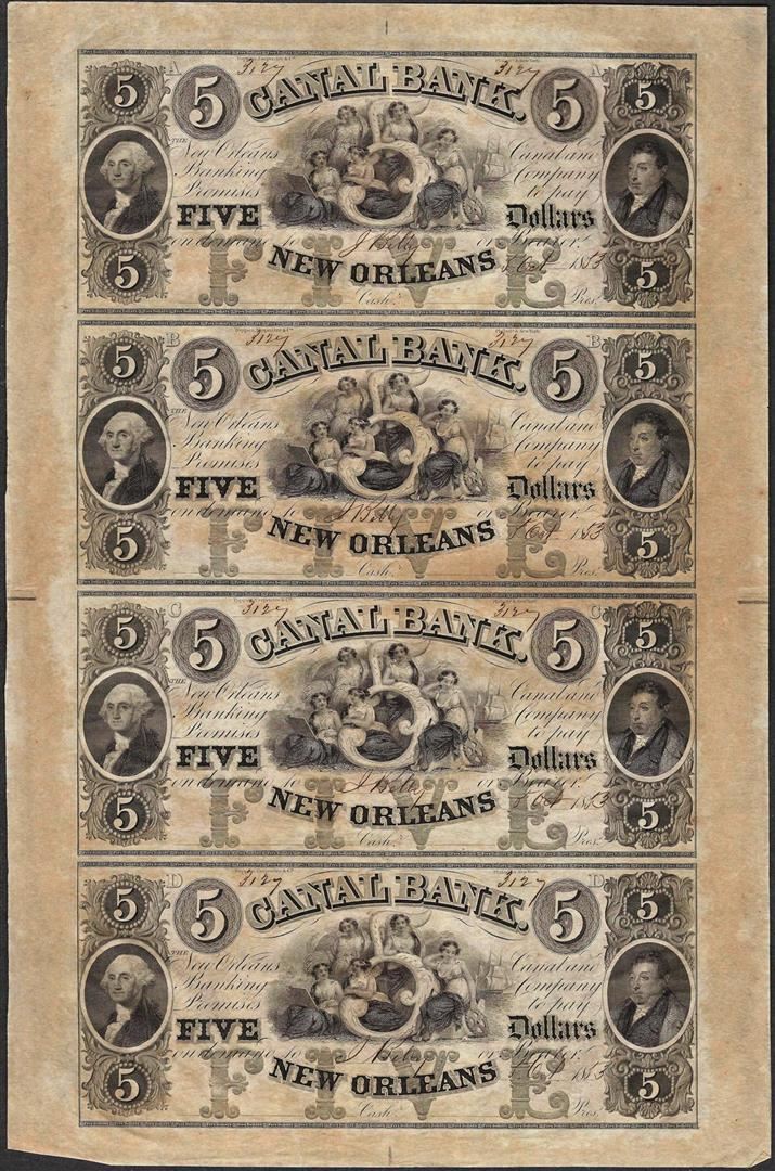 One Uncut Sheet of 1853 $5 Canal Bank Obsolete Notes.