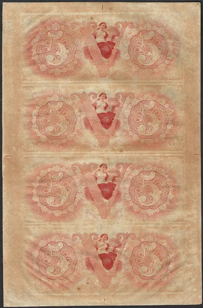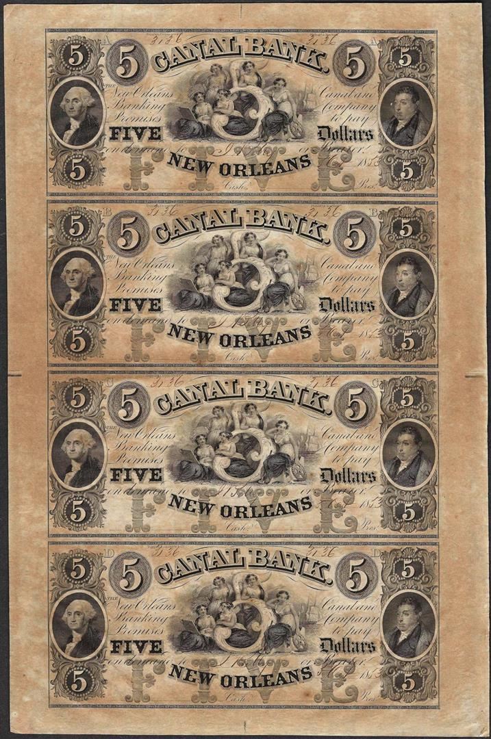 One Uncut Sheet of 1853 $5 Canal Bank Obsolete Notes.