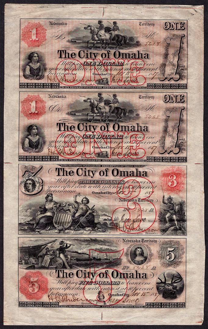 One Uncut Sheet of 1857 $1/$1/$3/$5 The City of Omaha Obsolete Bank Notes.