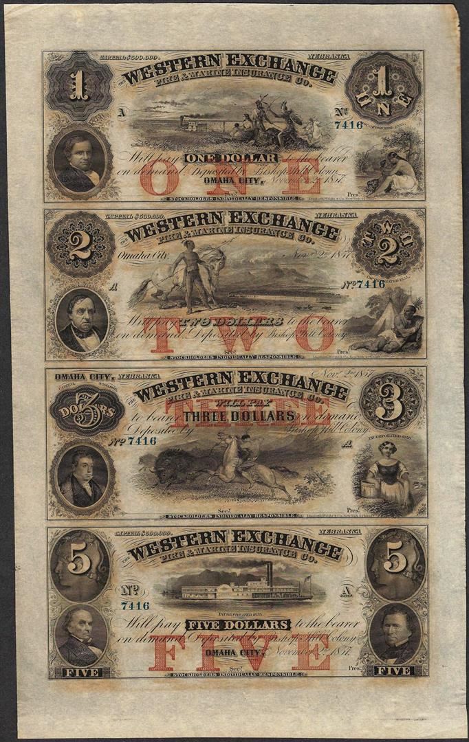 One Uncut Sheet of 1857 Western Exchange Fire & Marine Insurance Co. Obsolete Notes.