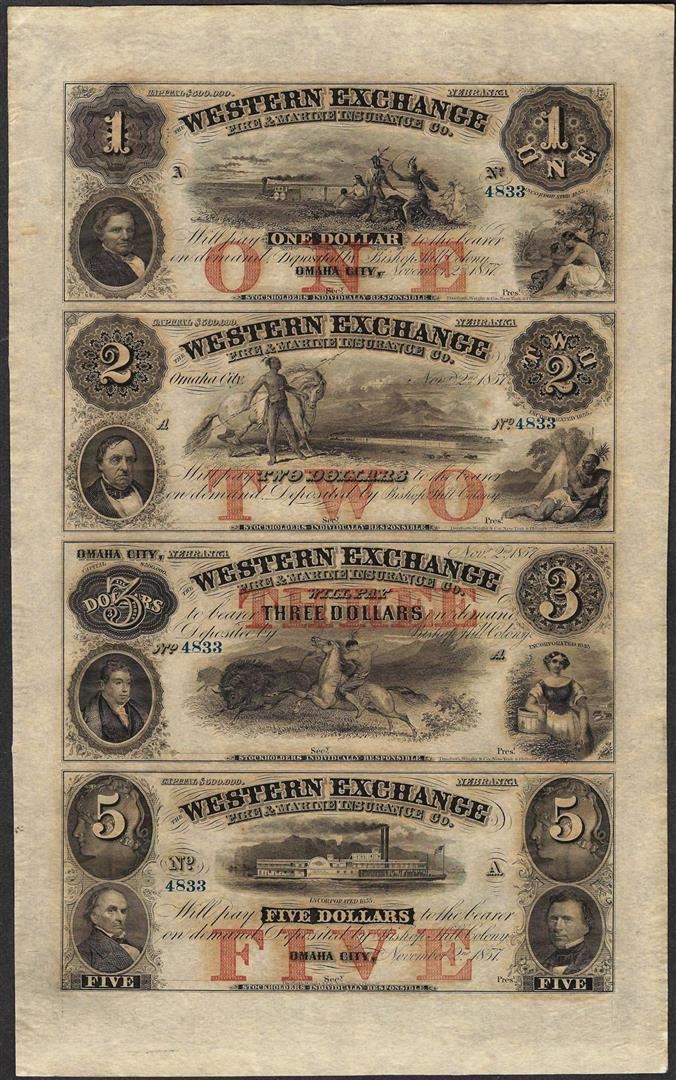 One Uncut Sheet of 1857 Western Exchange Fire & Marine Insurance Co. Obsolete Notes.