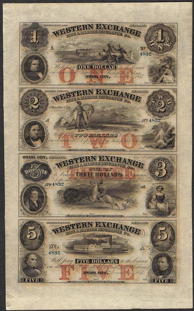 One Uncut Sheet of 1857 Western Exchange Fire & Marine Insurance Co. Obsolete Notes.