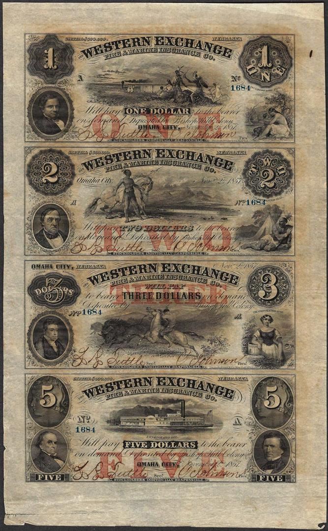 One Uncut Sheet of 1857 Western Exchange Fire & Marine Insurance Co. Obsolete Notes.