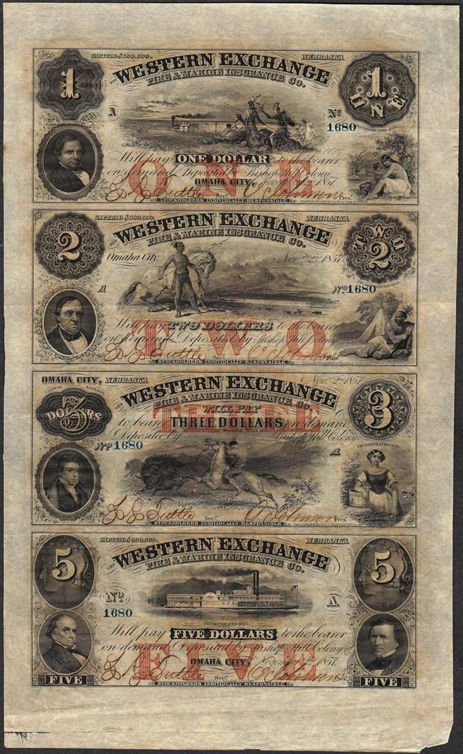 One Uncut Sheet of 1857 Western Exchange Fire & Marine Insurance Co. Obsolete Notes.