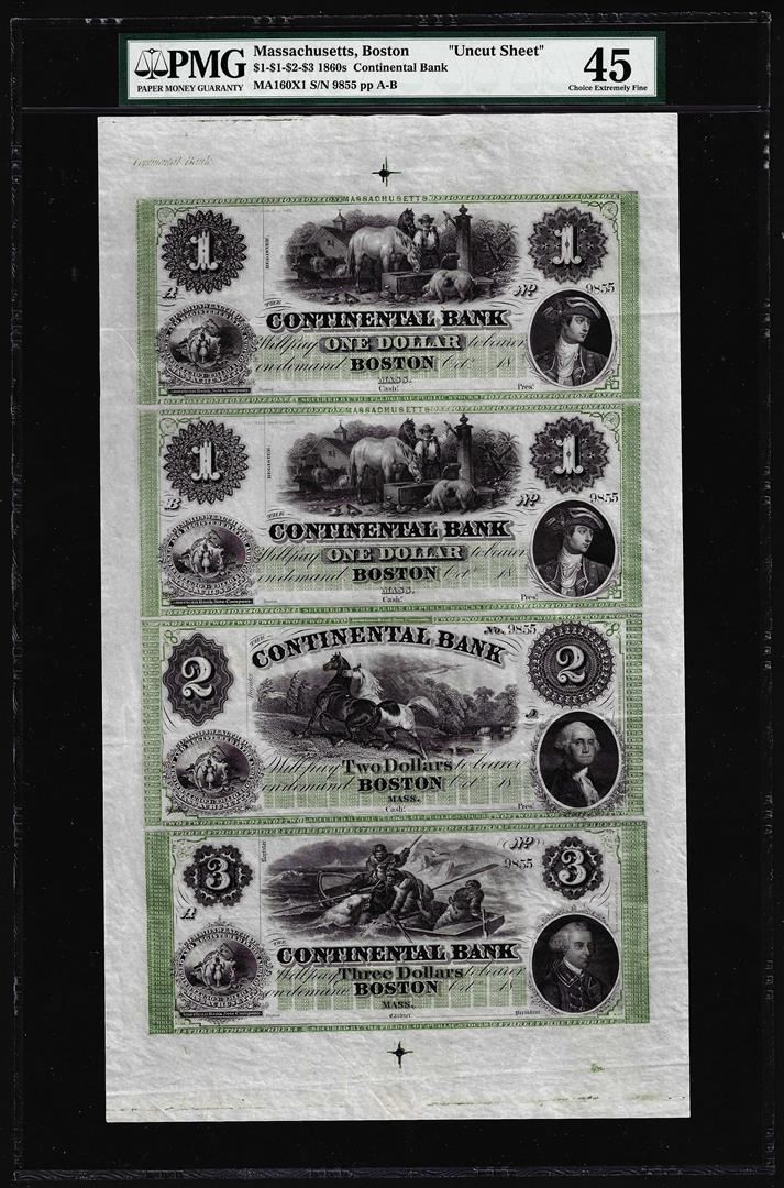 One Uncut Sheet of 1860's $1/1/2/3 Continental Bank Boston Obsolete Notes PMG 45 Choice Extremely Fine. A very popular and scarce example of the famous $3 that has four fur-clad Arctic explorers in a small boat attempting to fend off an aggressive polar bear rising out of the water. PMG Certified.